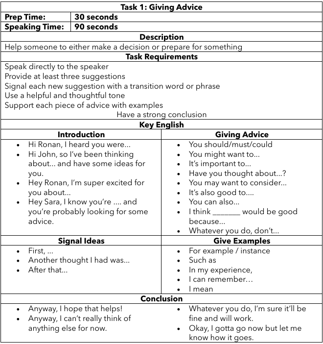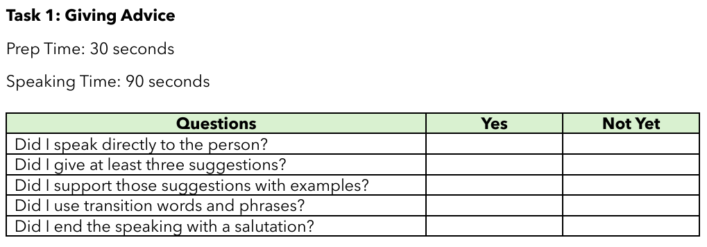 The CELPIP Speaking Checklist can help you check your answers and make sure you know exactly what to say and when to say it: