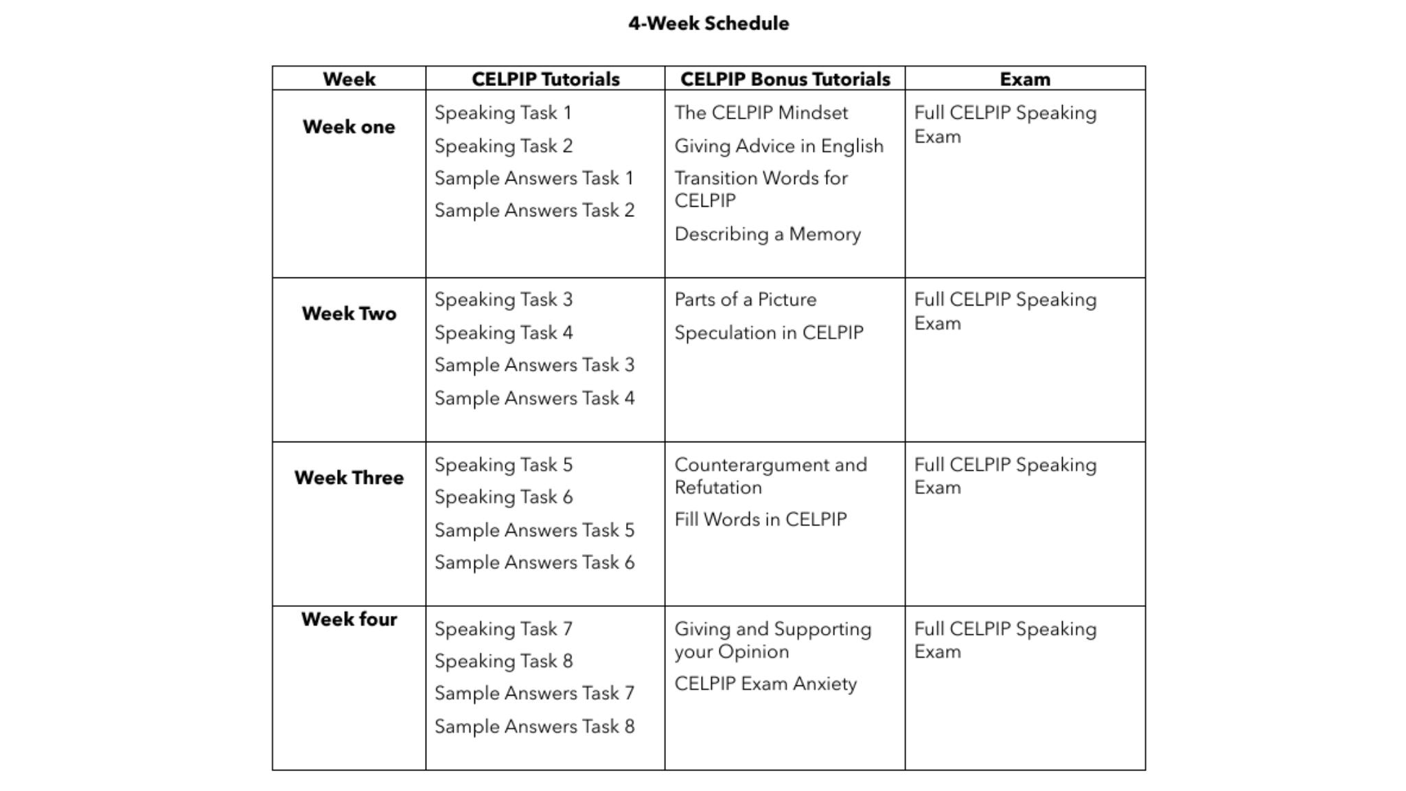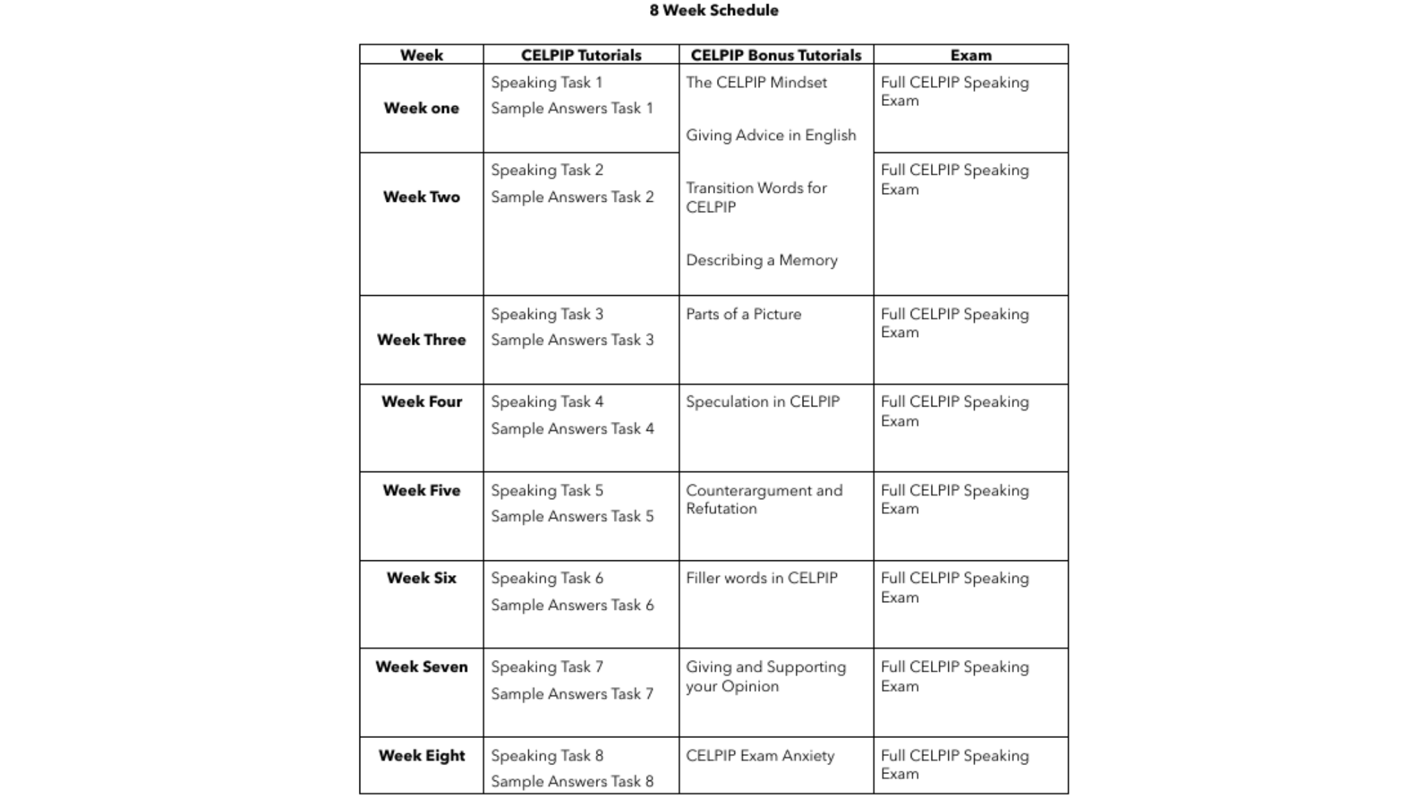 If you're lost and not sure where to start, this is where you start. This program presents you with everything you need to prepare for CELPIP speaking in either 4 or 8 weeks, you choose.